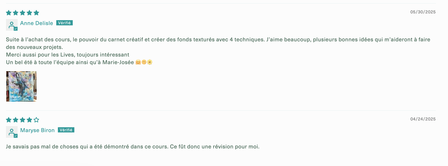 J’enseigne la peinture acrylique et les techniques mixtes à travers des ateliers en présentiel, des retraites artistiques ainsi que plus de 30 cours en ligne que je vous offre accessibles 24/7.
