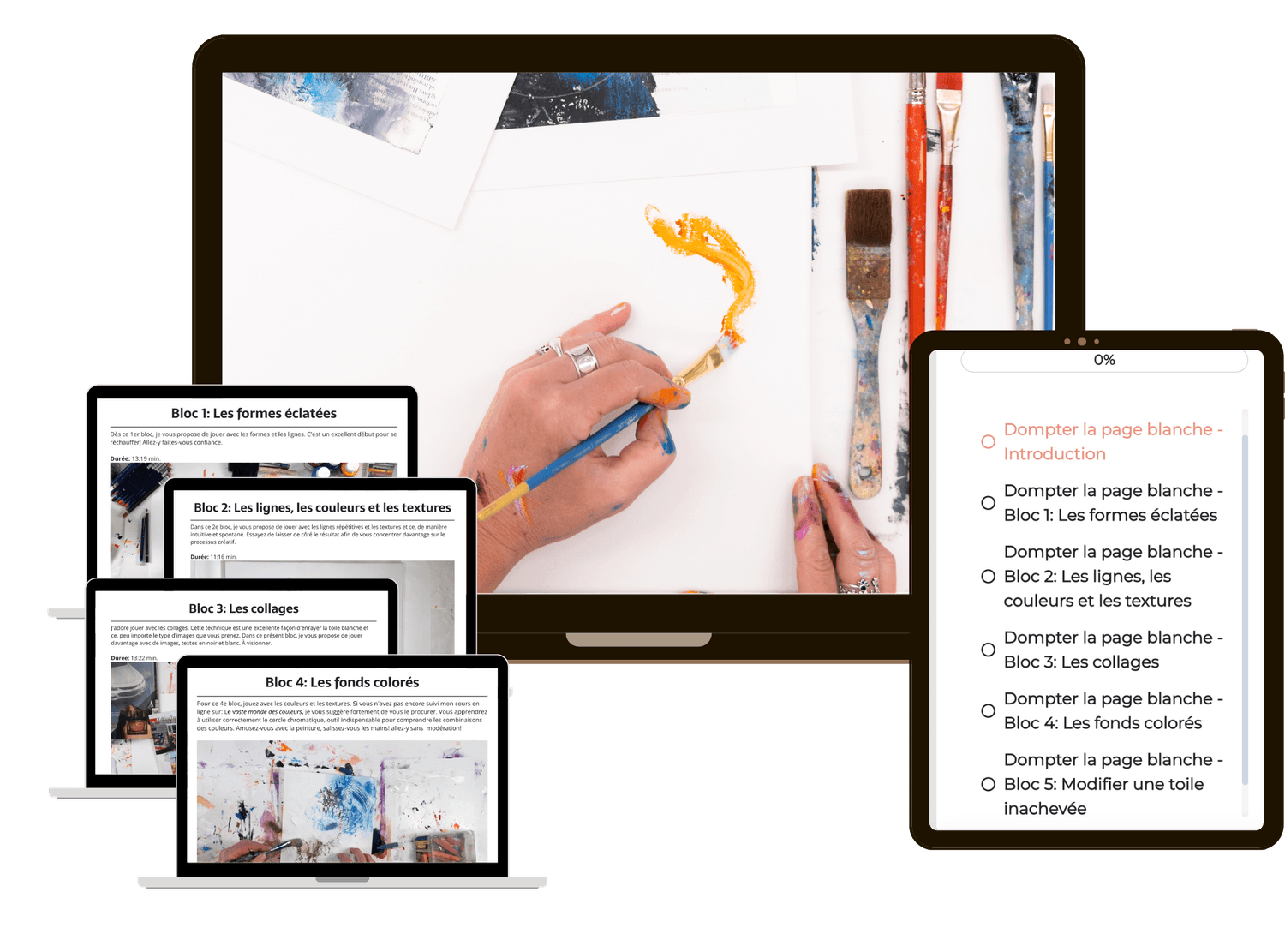 J’enseigne la peinture acrylique et les techniques mixtes à travers des ateliers et plus de 30 cours en ligne accessibles 24/7.